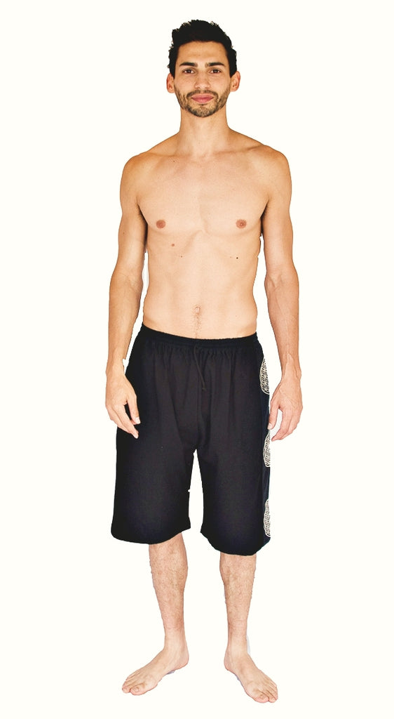 Simple and classic all cotton elastic waist band shorts. Asymmetrical pattern featuring flower of life pattern on one leg. Two side pockets and one back pocket.