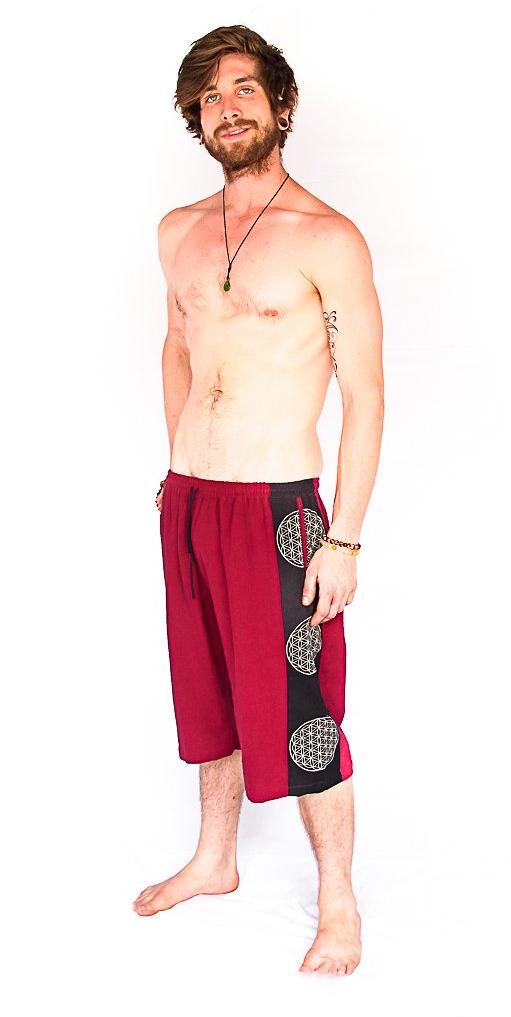 Simple and classic all cotton elastic waist band shorts. Asymmetrical pattern featuring flower of life pattern on one leg. Two side pockets and one back pocket.