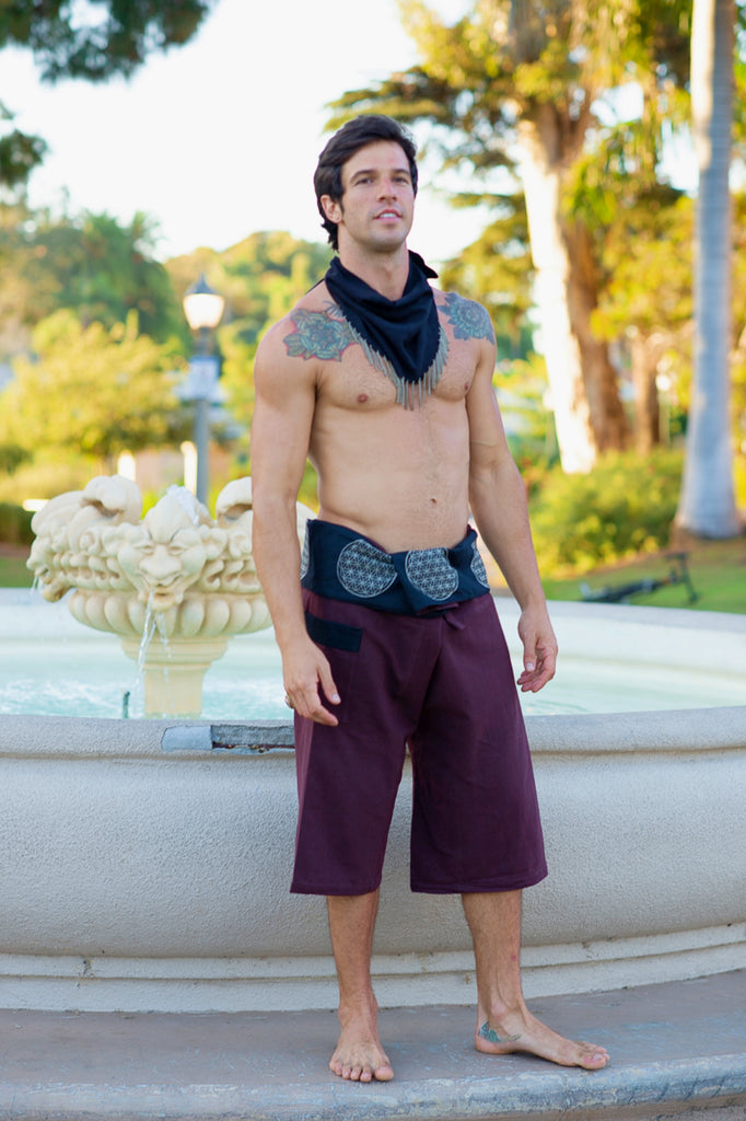 Our take on a traditional “Thai Fisherman” pant. 100% high quality hand dyed cotton with a printed band in either the ancient symbol of “flower of life” or “Ohm”. A wonderful alternative to your regular yoga shorts, or just so amazingly comfortable to wear around the house or out to casual events. These are one size fits all "natural wrap" and tie shorts. Popular with Yogi's, Message Therapists, and any other activities that require a free range of motion.