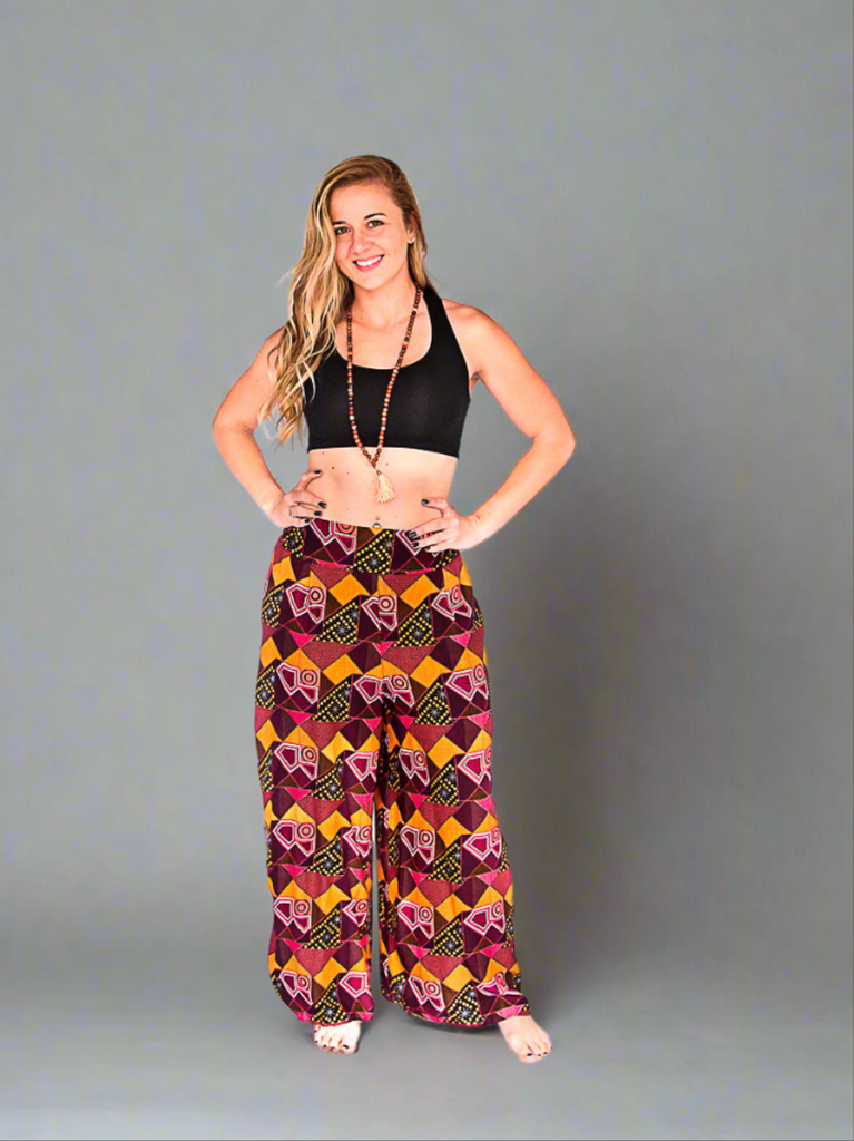 These slimming, soft, wide leg palazzo style pants are sure to keep you in the flow! Not only are they super comfortable and soft, but they have pockets! A flat waist band with elastic in the back and two hidden pockets on each side seam allow you to have total function and slimming fashion! Check out our “new retro” and “psychedelic mandala” pattern designs!