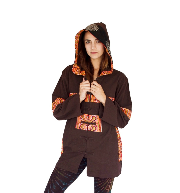 This one of a kind jacket is completely decked out from top to bottom with traditional fabric from the Black Hmong Hilltribe. This fabric was sourced in 2018 from the mountainous tribal village of Lao Chai in northern Vietnam. Each piece of fabric was purchased from the tribal woman that wove it, and sourced by us, in person. The sacred tribal patterns on this fabric represent symbols of love, luck and fortune that the Black Hmong people have used in their clothing throughout their entire history. It is made to be a loose fit with cotton buttons running down the front. It also features the "Flower of Life" symbol around the outside of the hood as well as down the back as seen in the photo. Each piece of handwoven fabric is a different size and shape, and allows us to make between one and three jackets with the fabric.