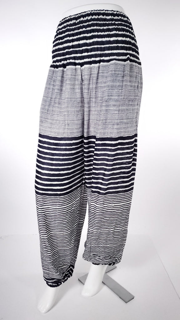 Classic style straight cut harem pants with a pocket are one of our most popular and comfortable pants. Elastic waist band and elastic ankle cuffs make for the perfect one size fits all pant great for any occasion. Whether your at the beach or at the studio these pants will make the perfect fit.