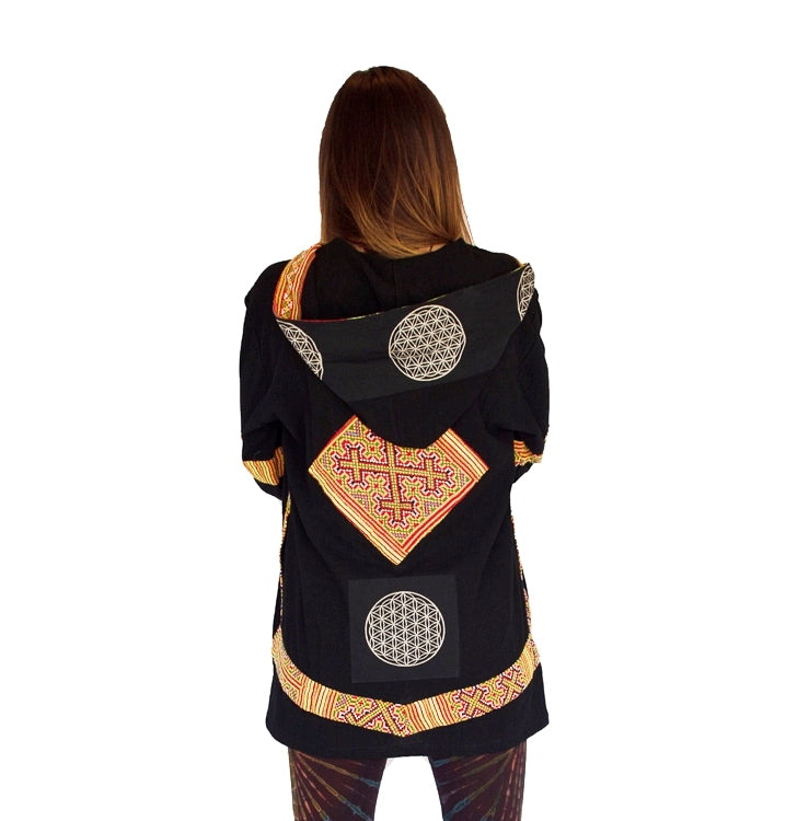 This one of a kind jacket is completely decked out from top to bottom with traditional fabric from the Flower Hmong Hilltribe. This fabric was sourced in 2018 from the mountainous tribal villages outside of Chiang Mai Thailand. Each piece of fabric was purchased from the tribal woman that wove it, and sourced by us, in person. The sacred tribal patterns on this fabric represent symbols of love, luck and fortune that the Flower Hmong people have used in their clothing throughout their entire history. It is made to be a loose fit with cotton buttons running down the front. It also features the "Flower of Life" symbol around the outside of the hood as well as down the back as seen in the photo. Each piece of handwoven fabric is a different size shape and pattern, but the colors the tribe uses are almost identical to the one shown in this photo. With that in mind, the jacket you purchase will be very similar to the one pictured but may have slight differentiation the woven patterns and colors.